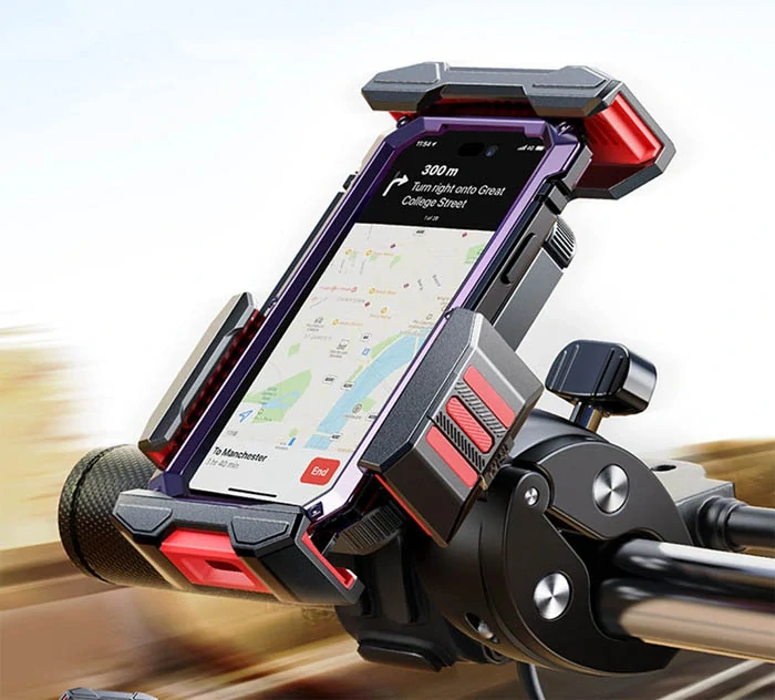- Pevně drží váš telefon na hrbolatých silnicích, cestách a chodnících. Držák má čtyři vestavěná pevná a hluboká ramena se silikonovými vložkami.