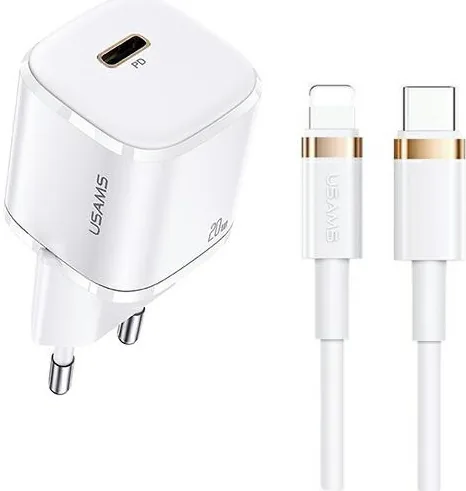 Síťová nabíječka USAMS 1xUSB-C T36 mini 20W + cable USB-C-Lightning white PD3.0 Fast Charging XFKXLOGTL02 (US-CC124+US-SJ484)